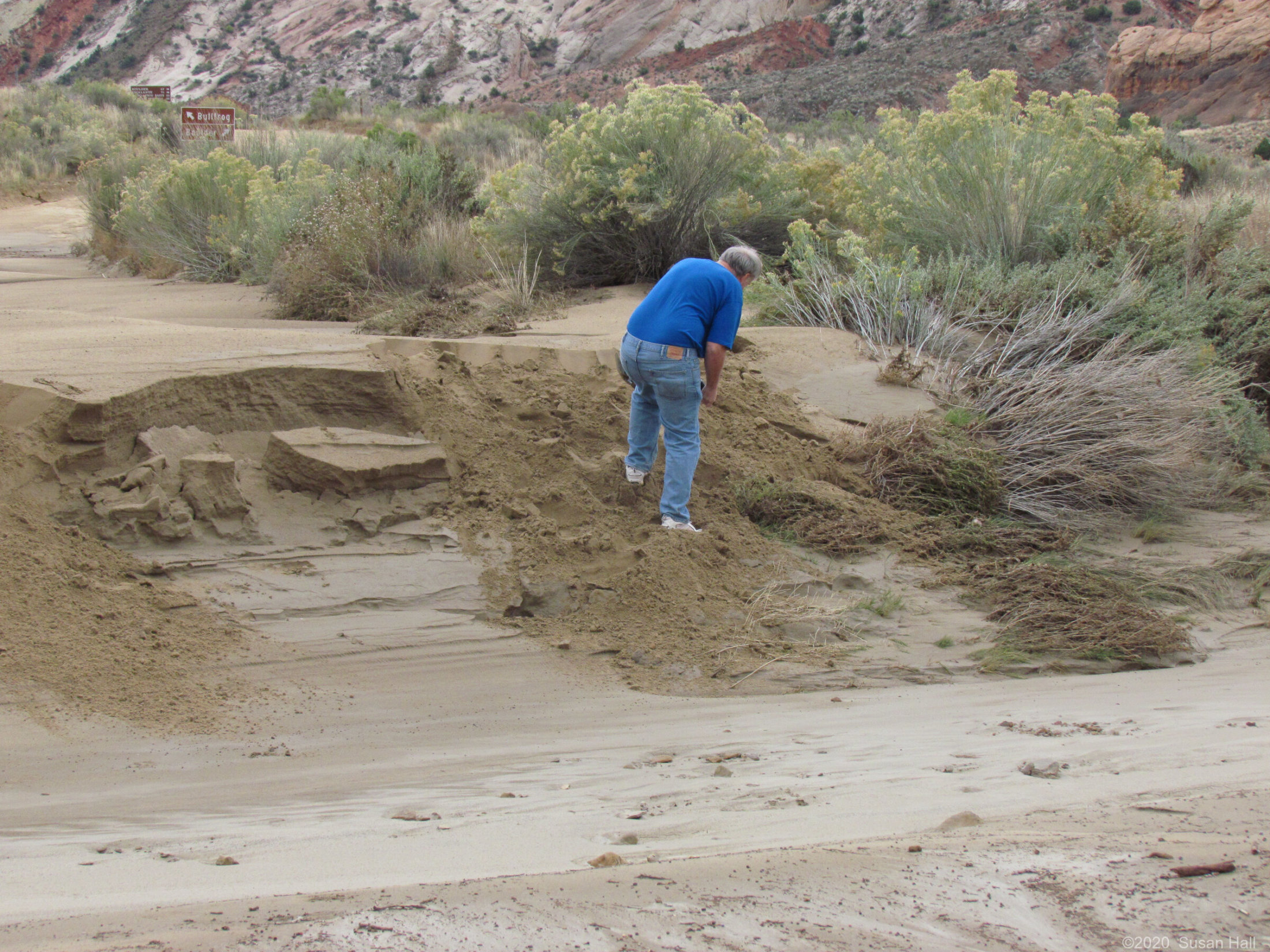 Before dark a road crew checking road damage found us. They went back to get a tractor. We hooked chains from the bucket to my rear bumper to lift and pull us out.