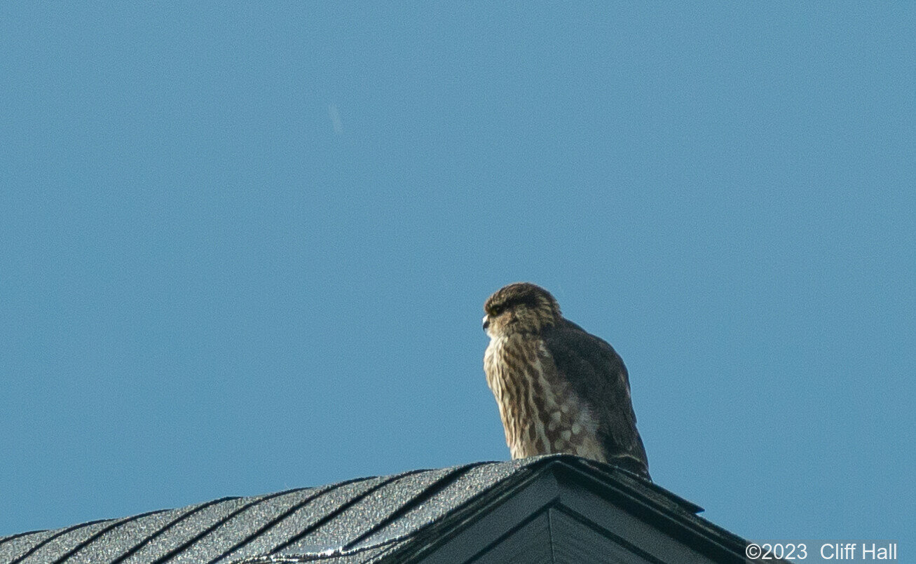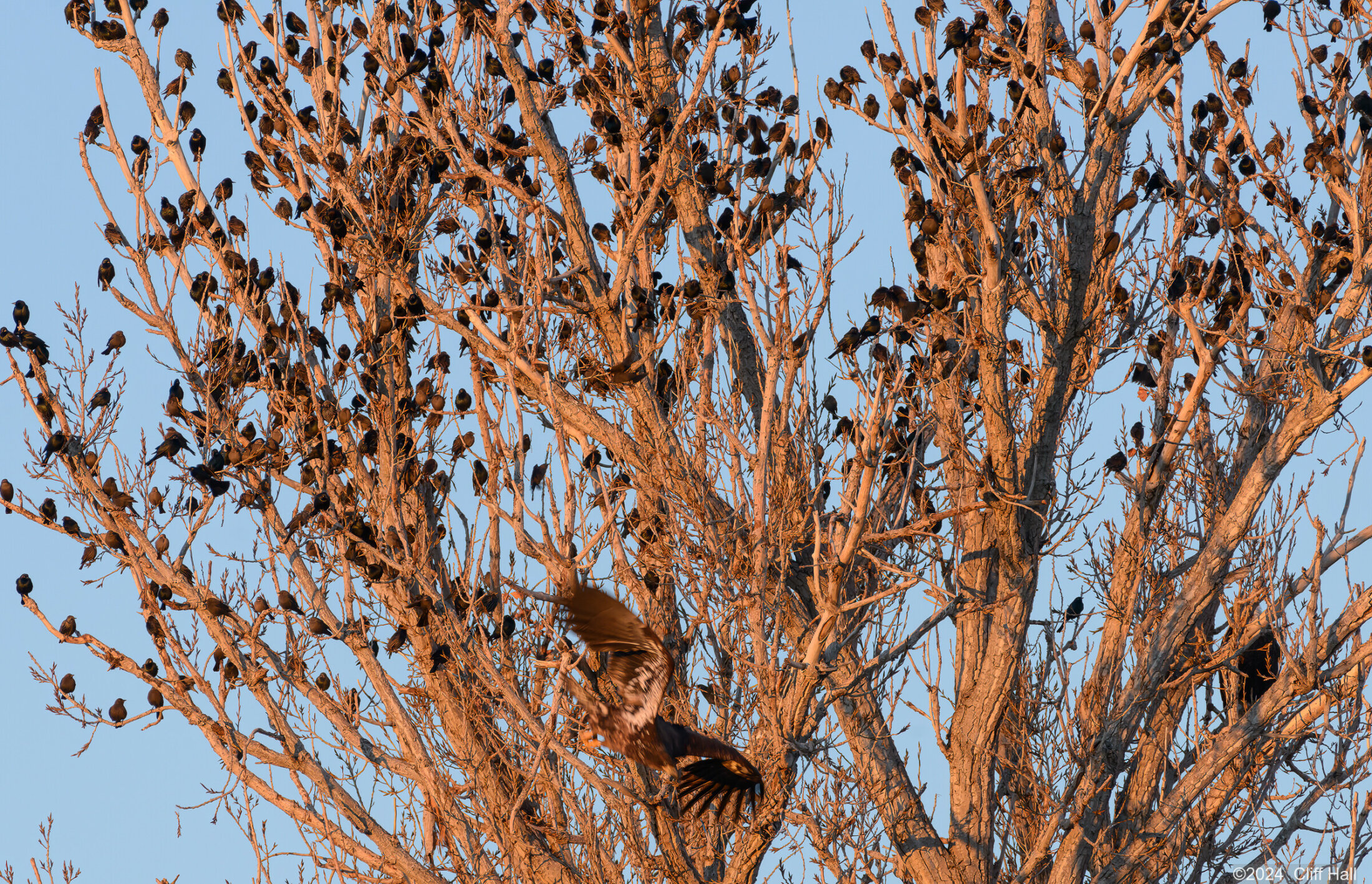 Eagle leaving as a flock of starlings stop in