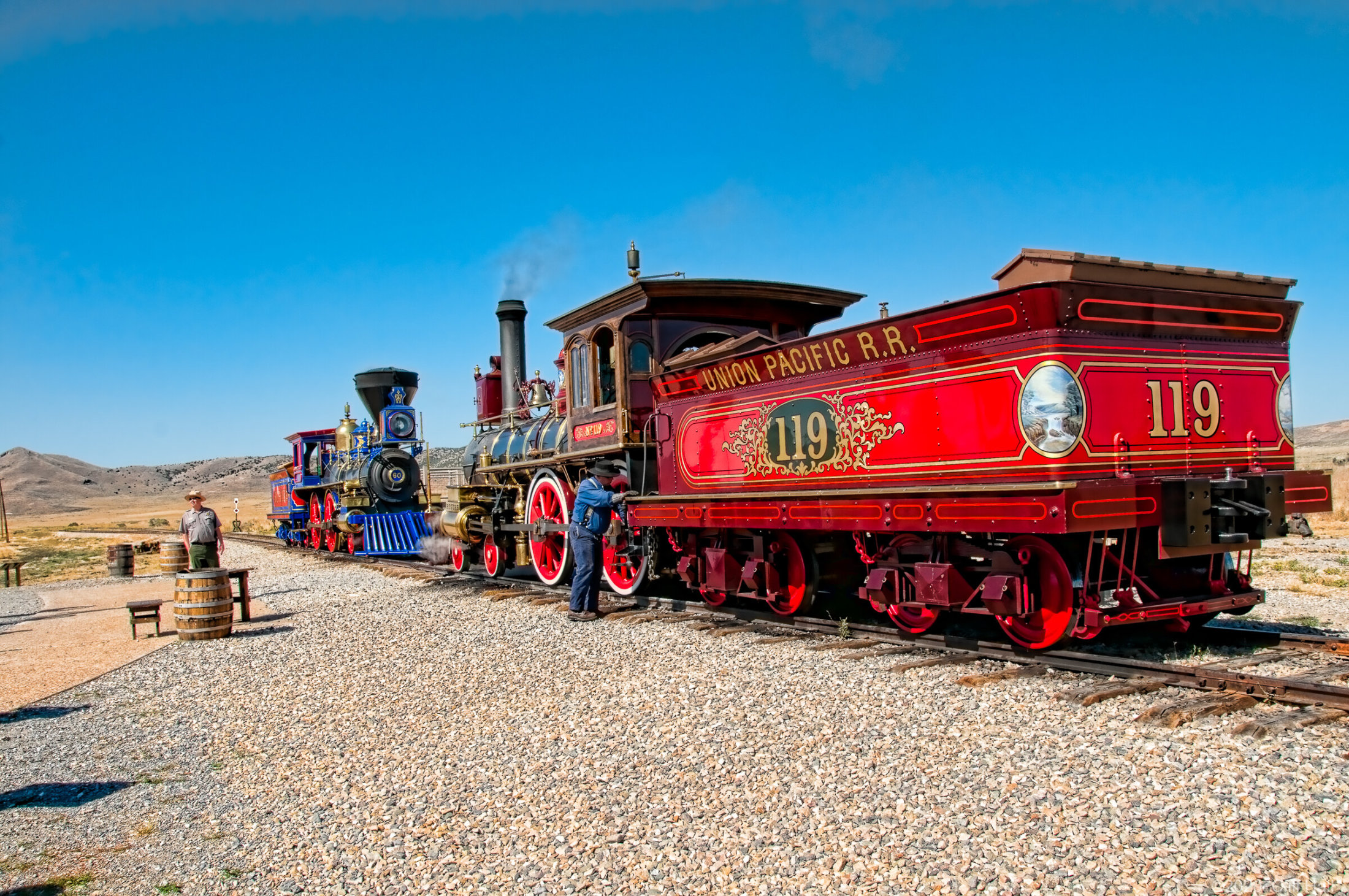 Smokestacks differences - wood burning for Central and coal burning for Union. Promontory Summit, Utah