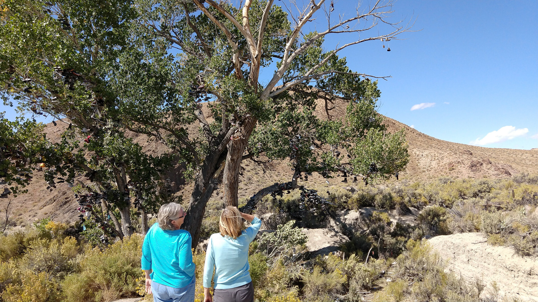 Folks toss old shoes into the tree, must be thousands up there. East of Fallon, NV