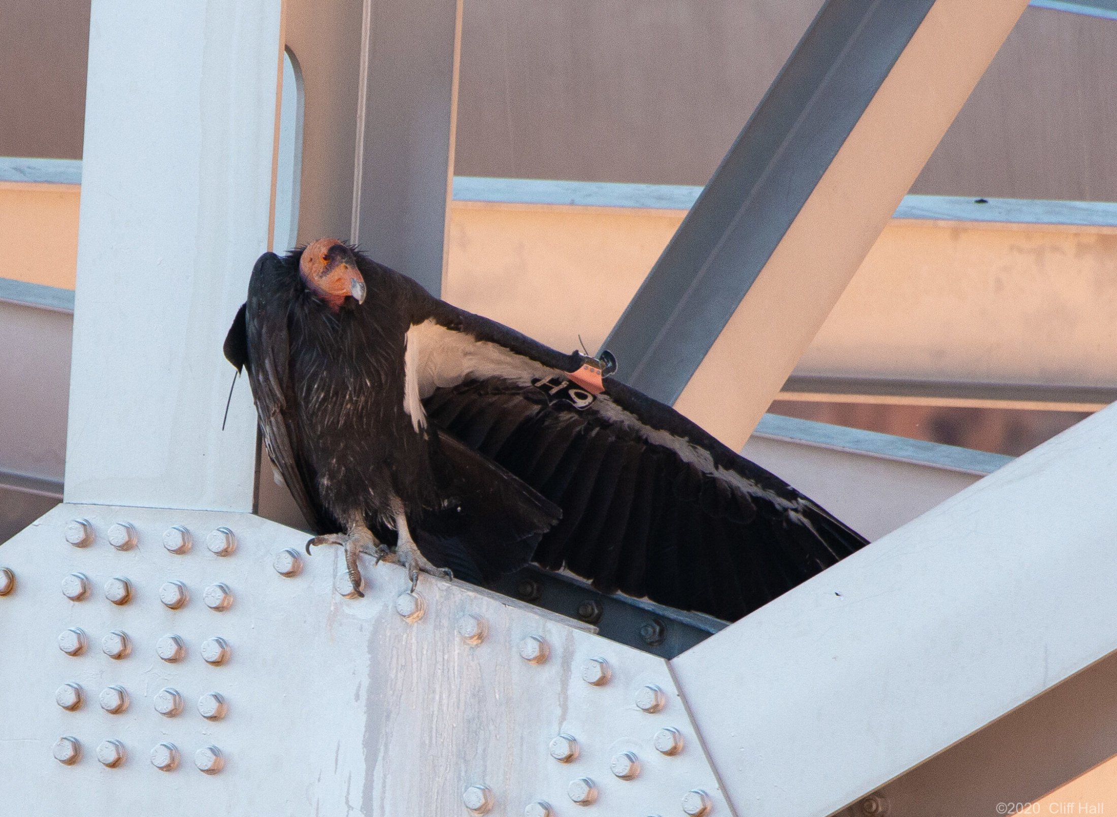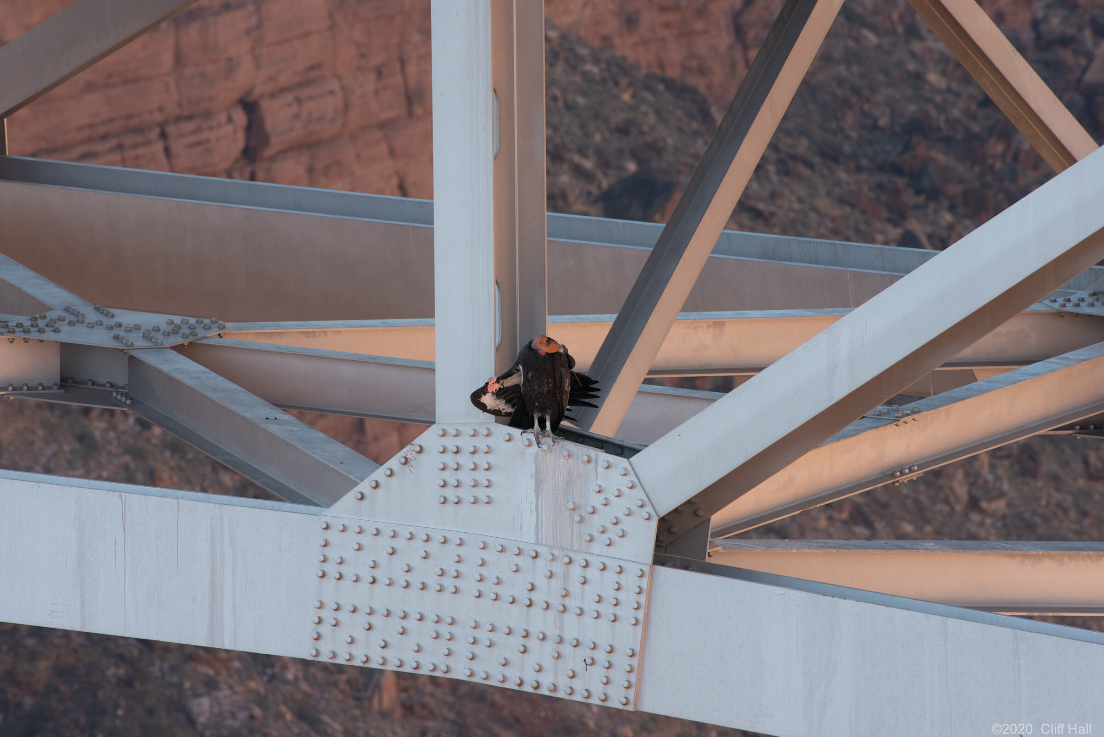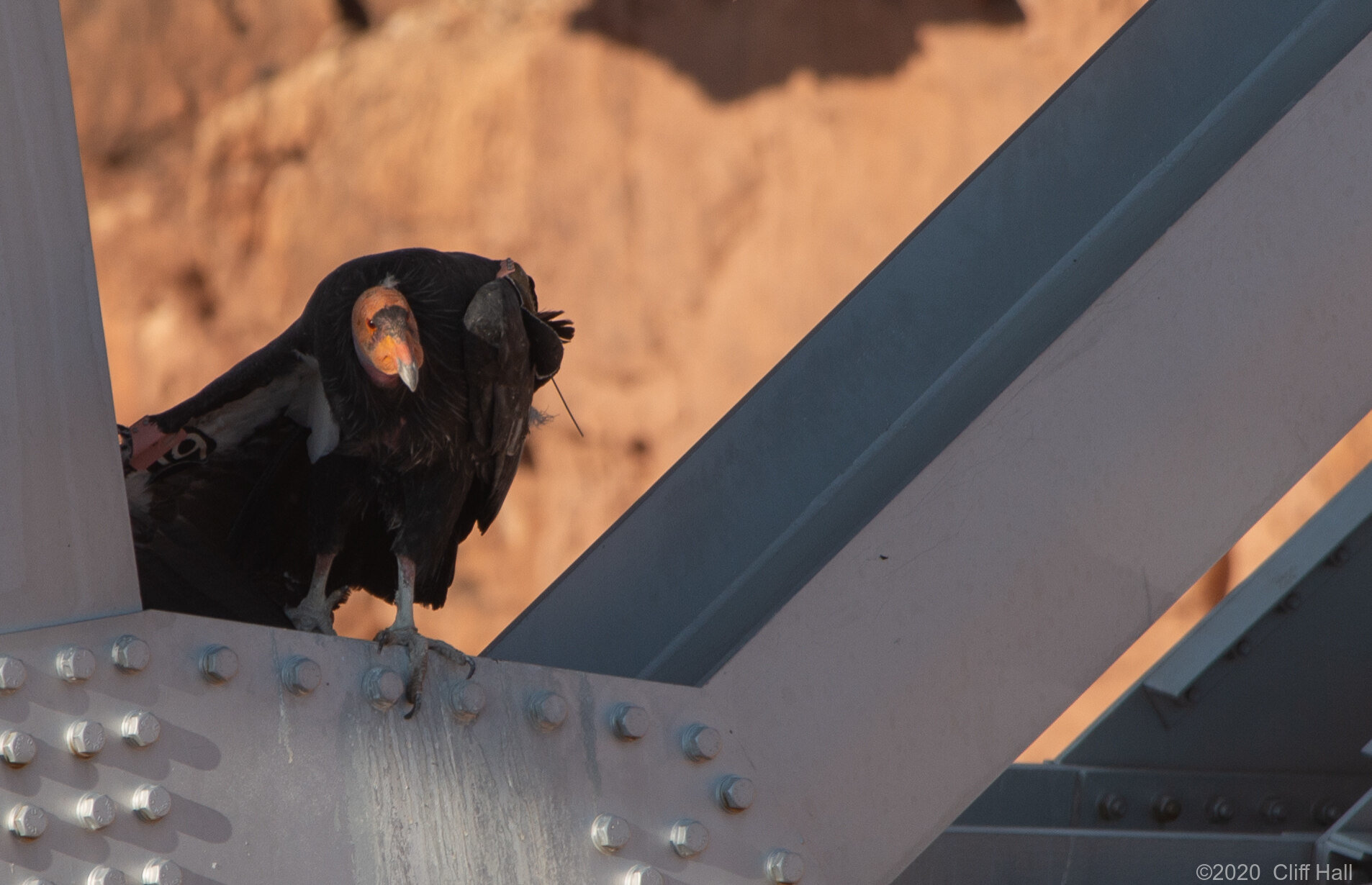 Condor [Gymnogyps californianus] equiped with a radio transmitter and ID tag. Marble Canyon, AZ